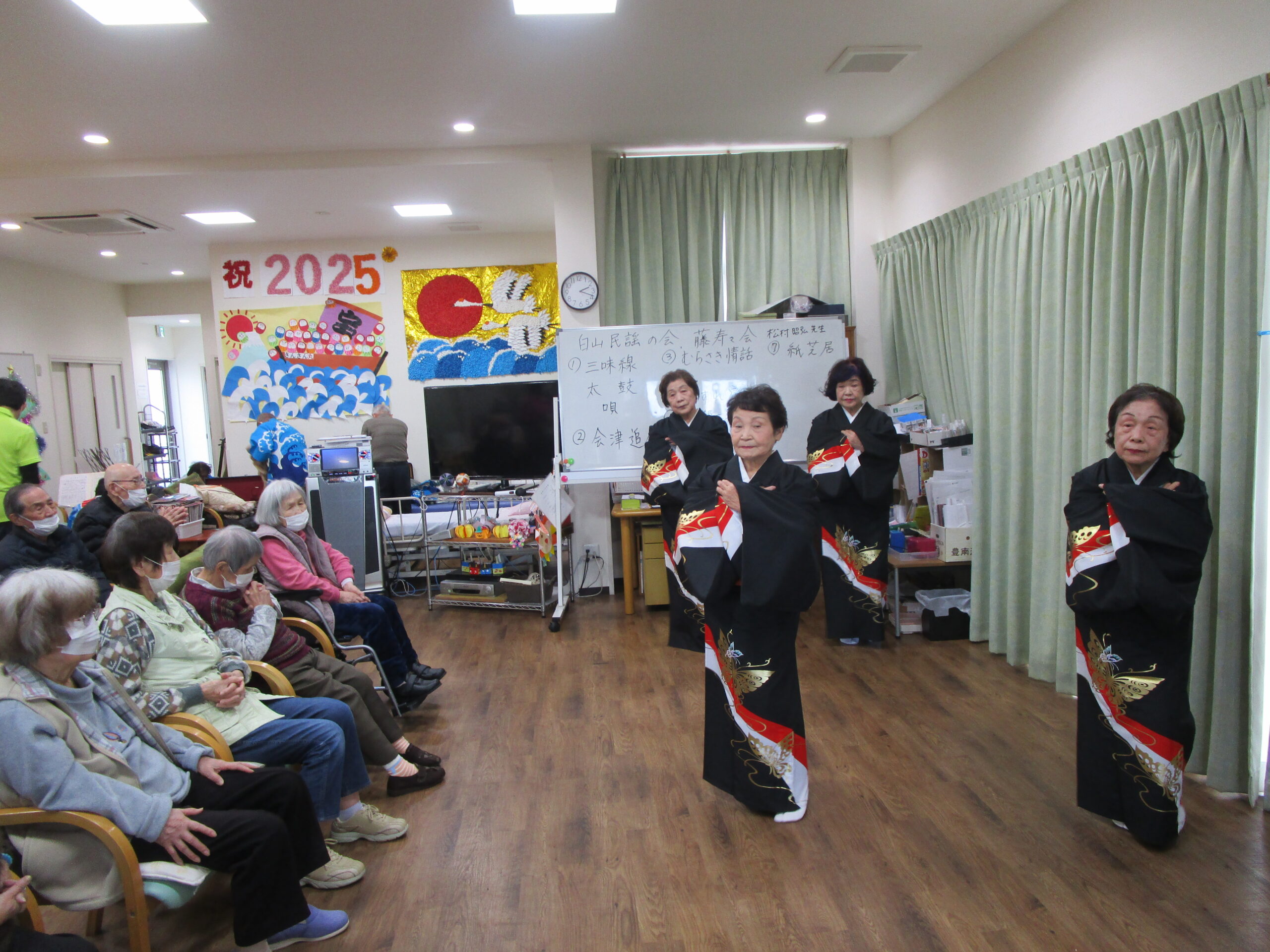 様々な慰問の方々が来てくださり楽しませていただいています。写真は相撲甚句と日舞の様子です。